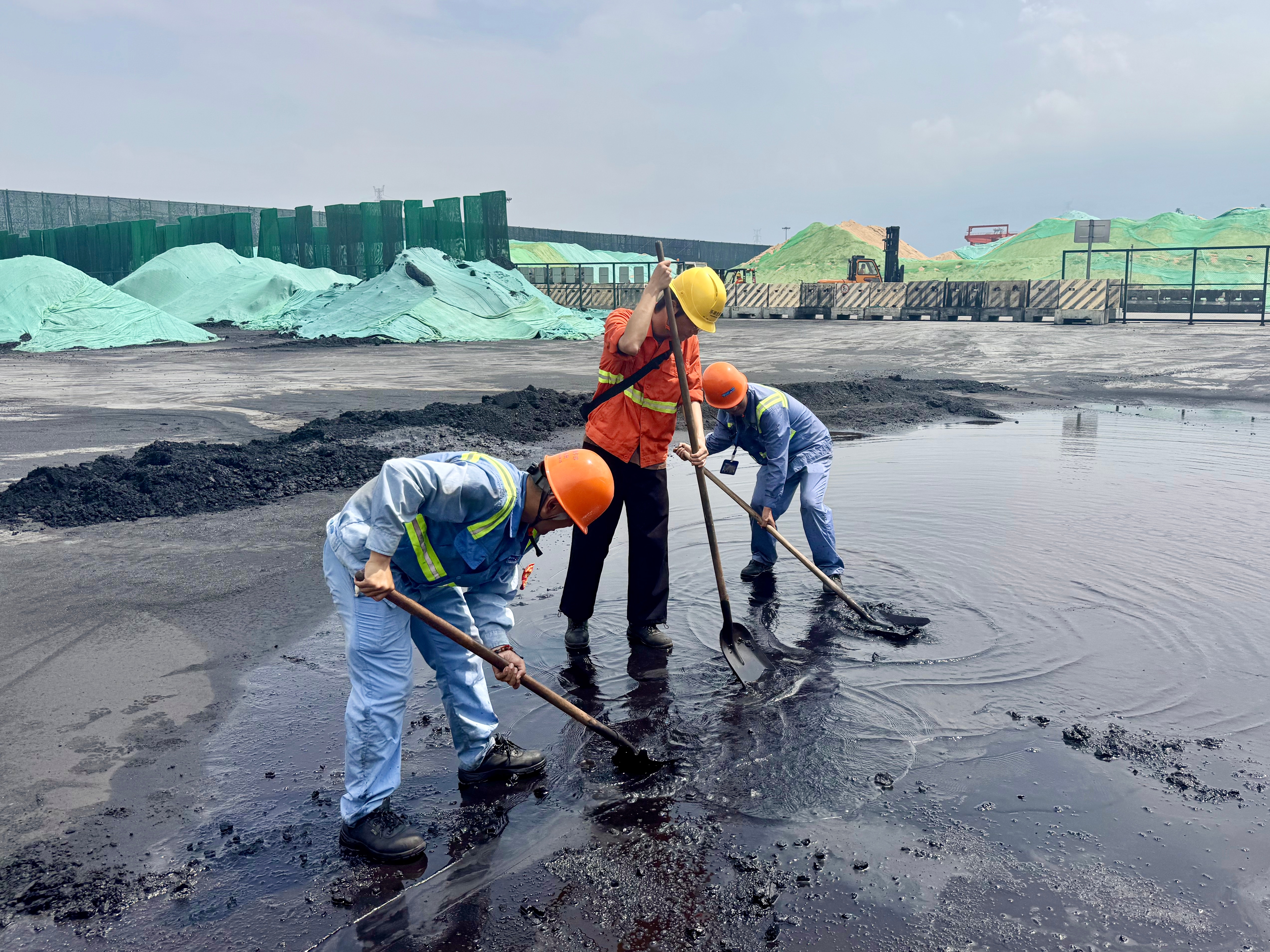与此同时,另一组志愿队伍203堆场的排水沟开展清淤疏通作业。面对沟内堆积淤泥堵塞杂物,大家卷起衣袖手持铁锹、扫把,不畏高温与脏累,协力奋战 ,逐段清理打通排水“堵点”,保障了作业区域排水畅通,消除潜在的安全隐患,切实提升了汛期排涝能力