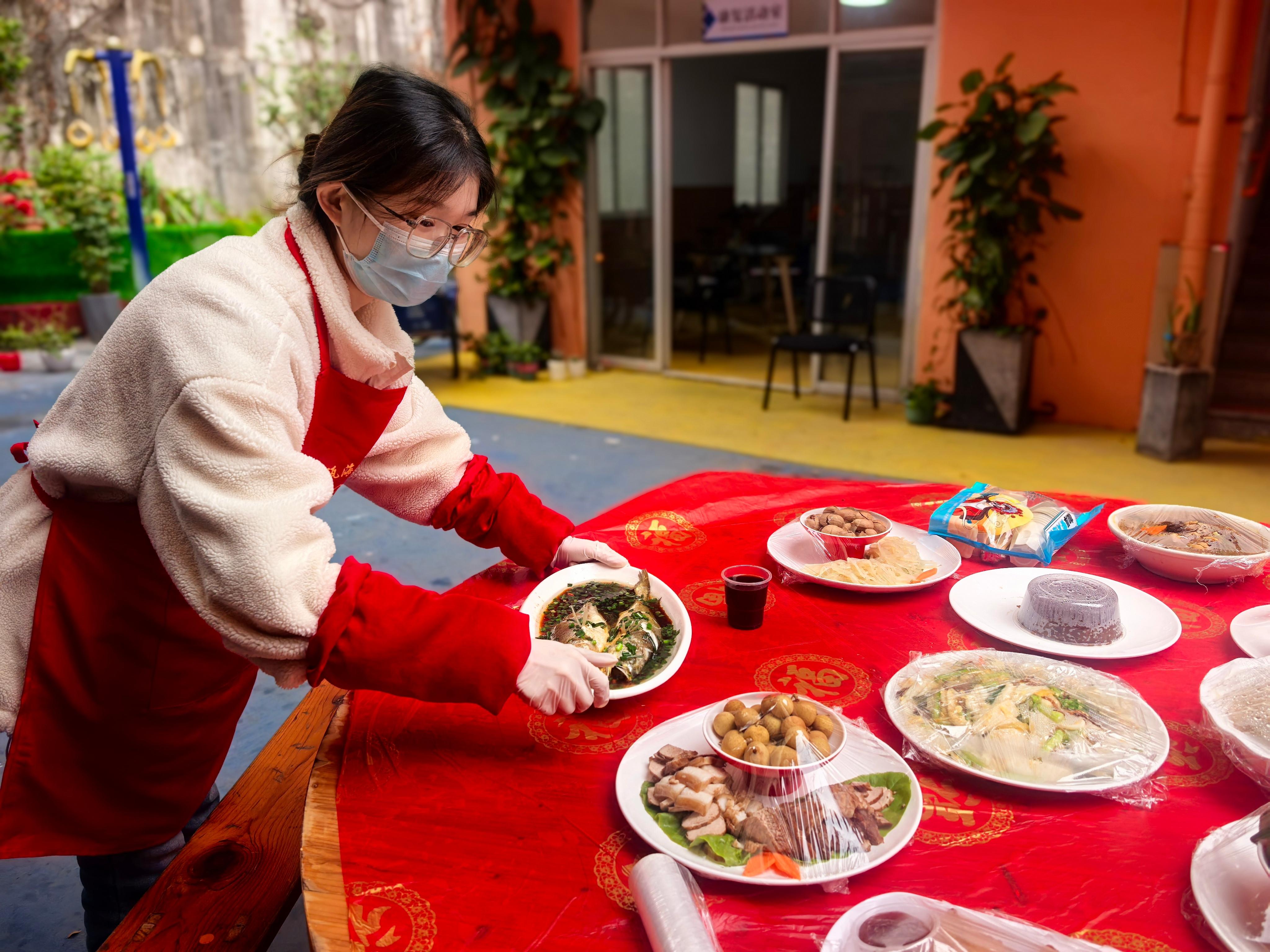 活动现场,青年志愿者们分工明确、干劲十足。有的与老人们促膝谈心,拉家常、问冷暖;有的撸起袖子,洗菜切配、起锅烧油,热火朝天地准备菜肴。数小时后,一桌桌丰盛可口的酒席整齐摆开,老人们围坐一堂,品尝着美味佳肴,脸上洋溢着幸福的笑容,现场欢声笑语不断,温情满满。