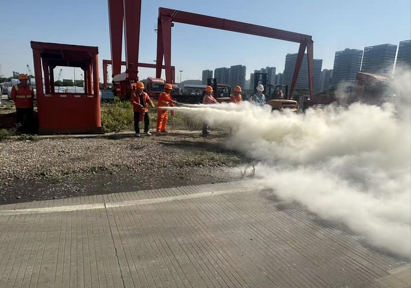 中午12时45分许,演练正式启动。模拟场景设定为码头15号堆场6吨9号叉车线路短路发生自然初起火情,无法及时扑灭,烟雾迅速弥漫。值班人员发现险情后,立即启动应急预案,各成员按照预案穿戴防护装备,携带灭火器与消防水带冲向火源、引导周围人员沿安全通有序撤离、在堆场起火点附近外围拉起警戒线、防止无关人员进入等各环节开展。整个演练过程紧张有序,队员们反应迅速、配合默契,从发现火情到完成扑救仅用时8分钟,圆满达成预期目标。