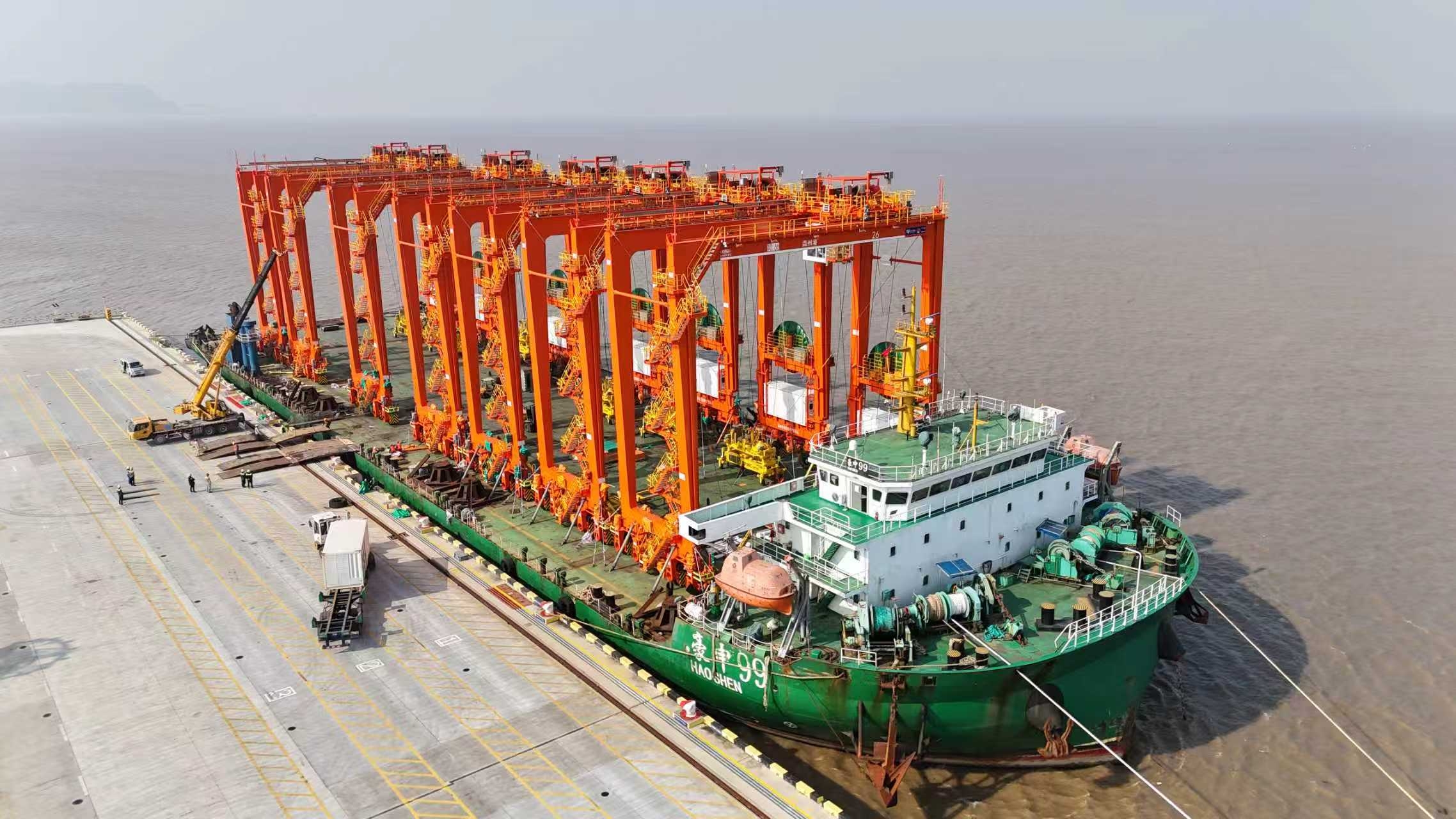 12月9日12时许,随着最后一台远控自动化龙门吊从“豪申99”轮平稳移至温州港状元岙港区码头,温州港集团首批引进的7台远控自动化龙门吊已全部成功上岸。这意味着温州港在智慧码头建设上迈出关键一步,港口装卸作业迈向“远程操控、智能自动”的新阶段。
