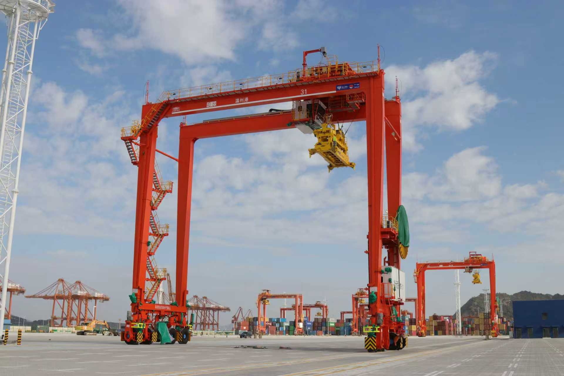 此次引进远控自动化龙门吊,是温州港适应船舶大型化、提升港口智慧化水平的重要举措。该批设备额定起重量为吊具下40.6吨,轨距23.47米,起升高度18米,采用电力驱动与先进的自动化控制技术,配备多重传感、高精度定位、自动纠偏及智能识别系统,可实现对集装箱装卸全过程的远程精准操控与自动化运行。